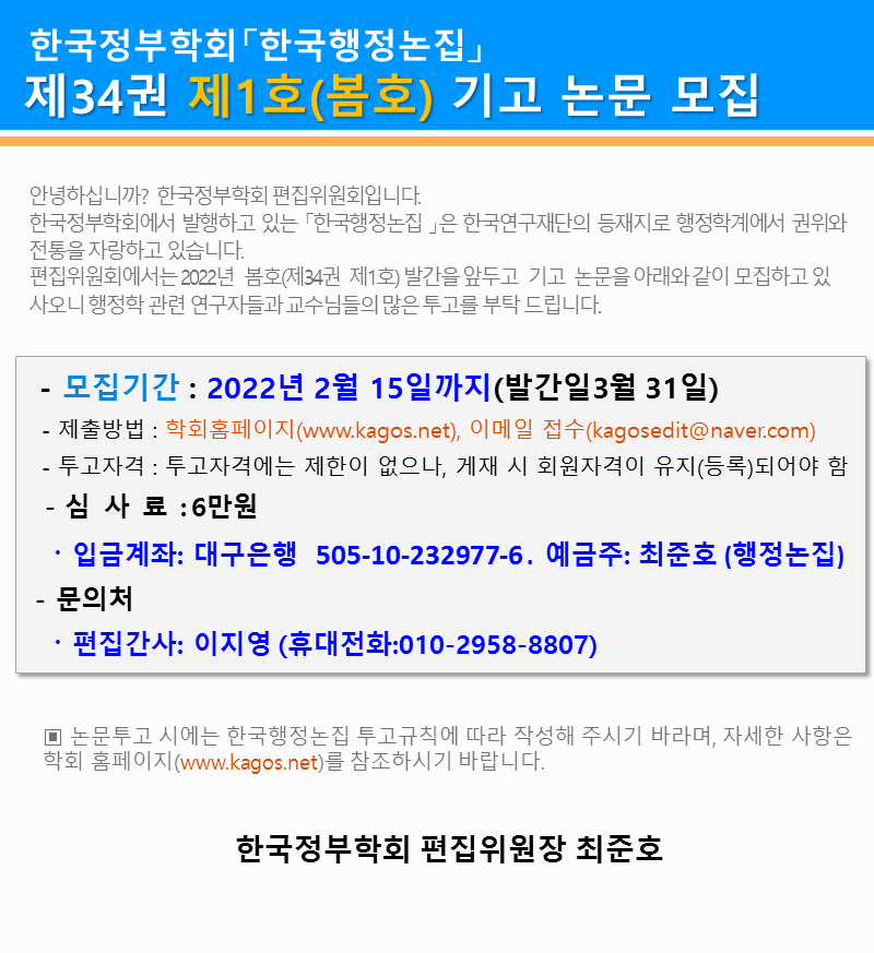 한국행정논집 34권 1호 논문기고 안내