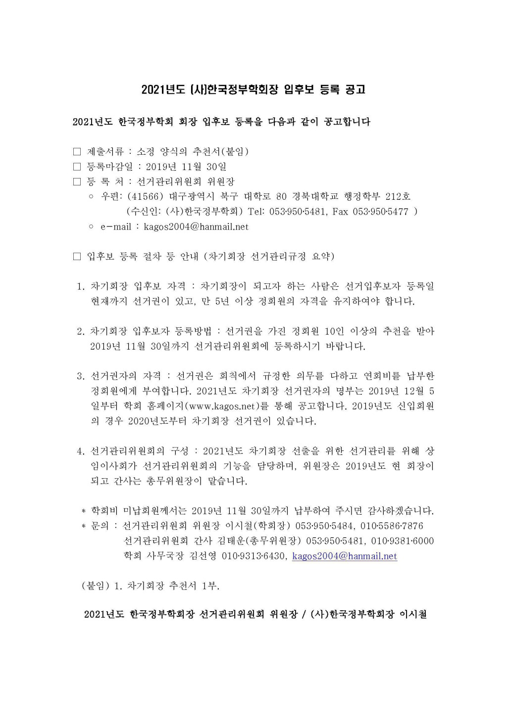 2021년도 (사)한국정부학회장 입후보 등록 공고