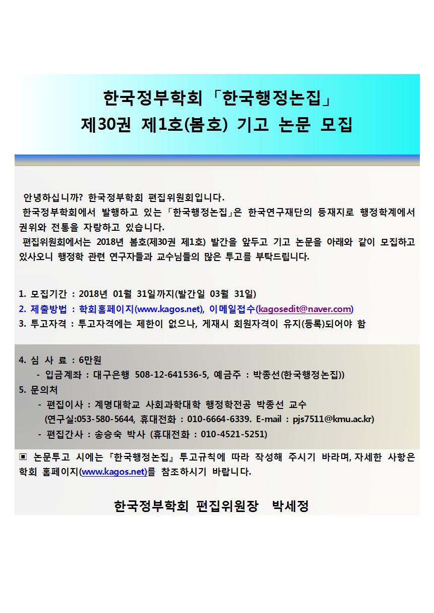 한국행정논집 제30권제1호 논문기고 공지