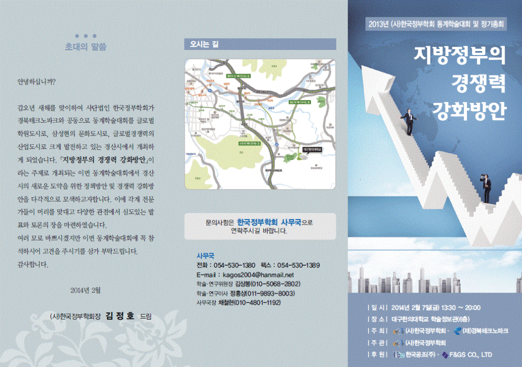 갑오년 새해를 맞이하여 사단법인 한국정부학회가 경북테크노파크와 공동으로 동계학술대회를 글로벌 학원도시로, 삼성현의 문화도시로, 글로벌경쟁력의 산업도시로 크게 발전하고 있는 경산시에서 개최하게 되었습니다. ‘지방정부의 경쟁력 강화방안’라는 주제로 개최되는 이번 동계학술대회에서 경산시의 새로운 도약을 위한 정책방안 및 경쟁력 강화방안을 다각적으로 모색하고자합니다. 이에 각계 전문가들이 머리를 맞대고 다양한 관점에서 심도있는 발표와 토론의 장을 마련하였습니다.