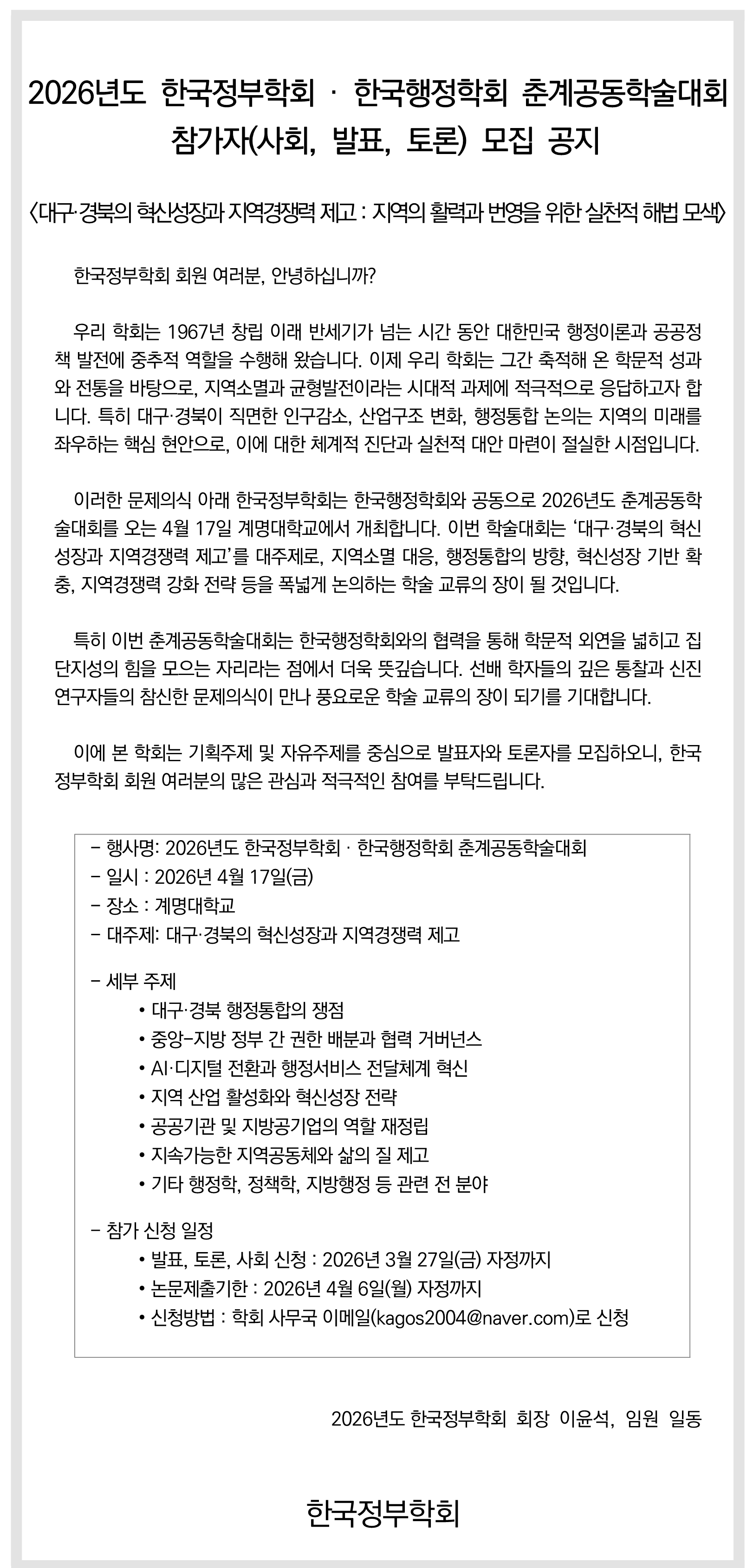 2026 한국정부학회·한국행정학회 춘계공동학술대회 참가자(사회, 발표, 토론) 모집 공지