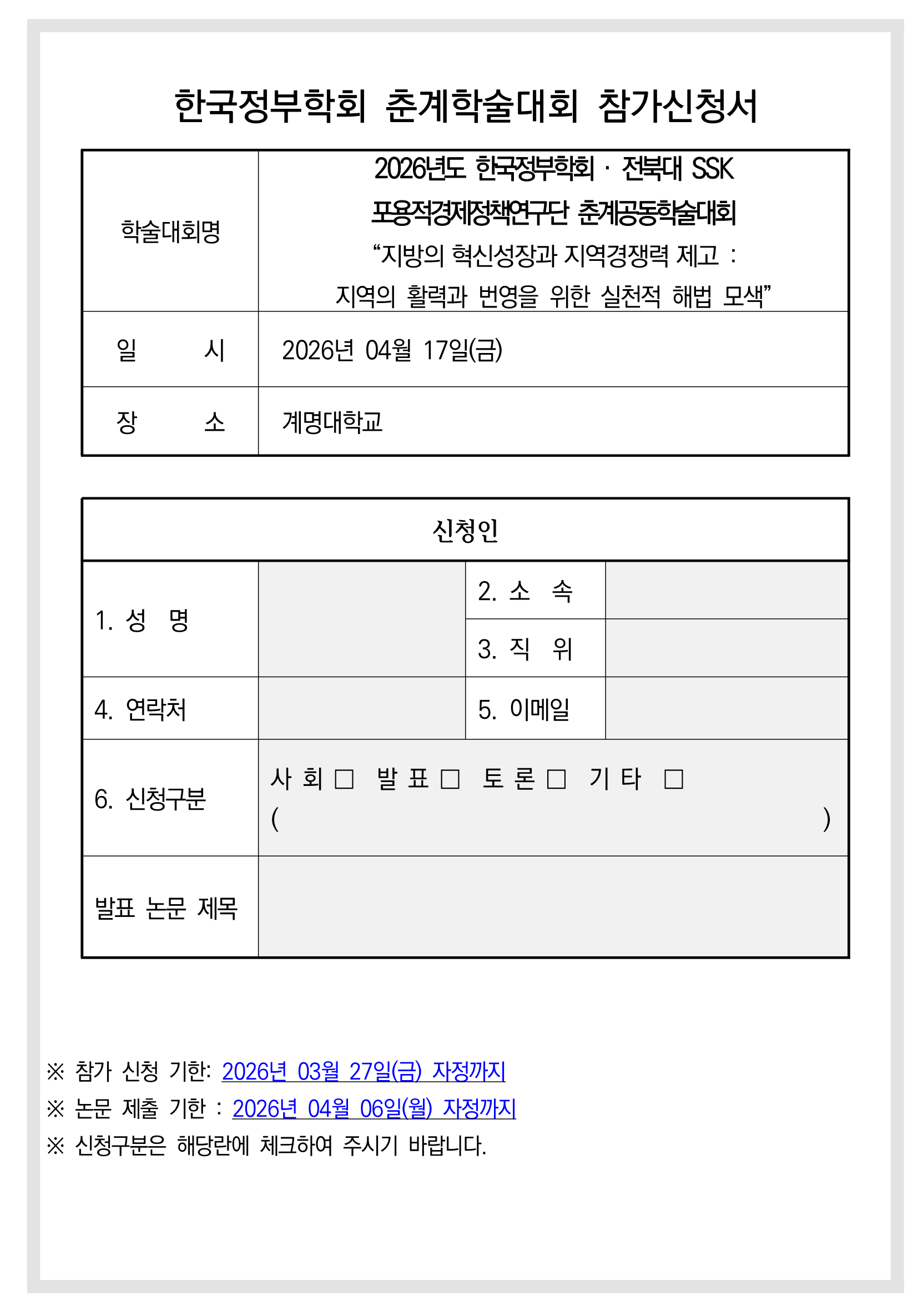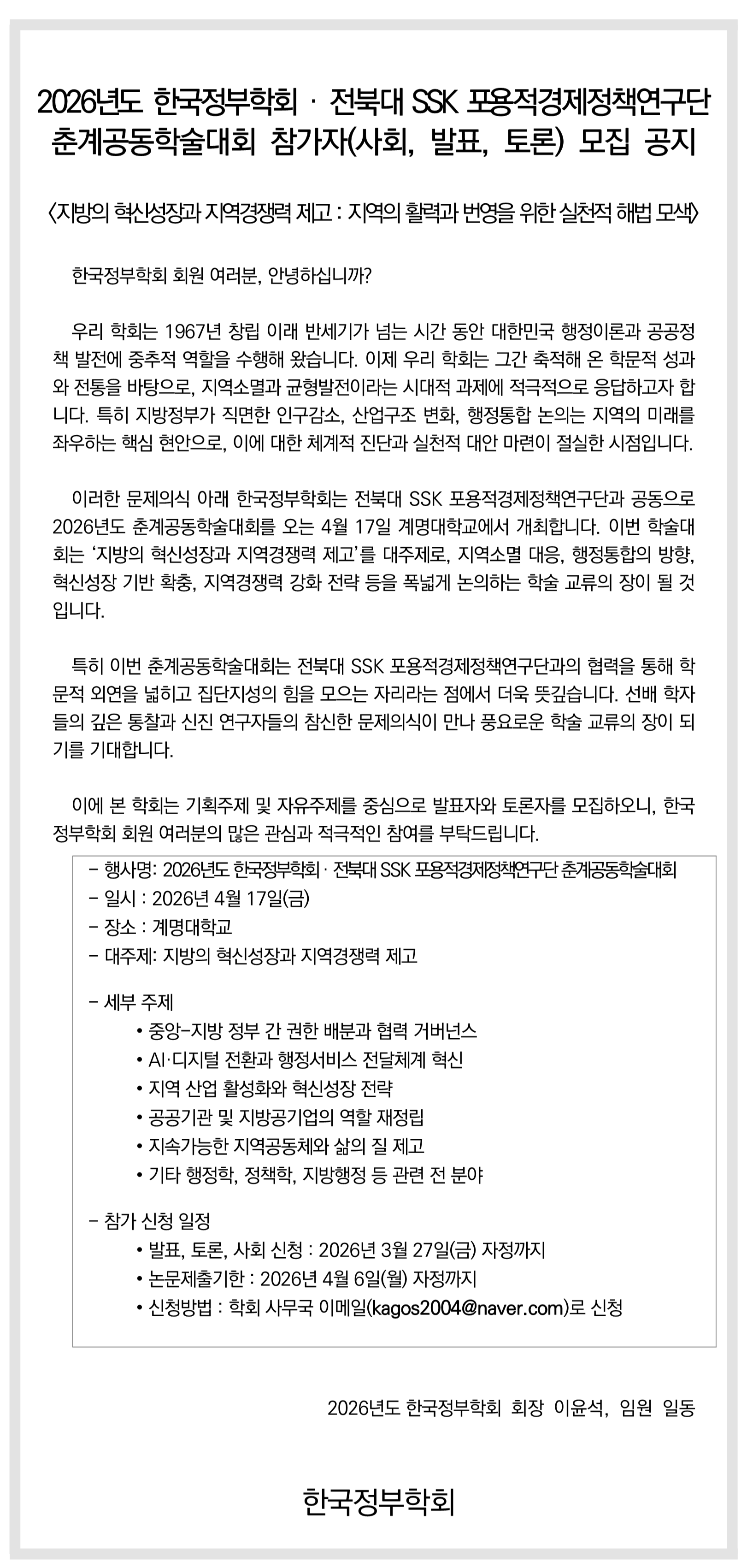 2026 한국정부학회·전북대 SSK 포용적경제정책연구단 춘계공동학술대회 참가자(사회, 발표, 토론) 모집 공지